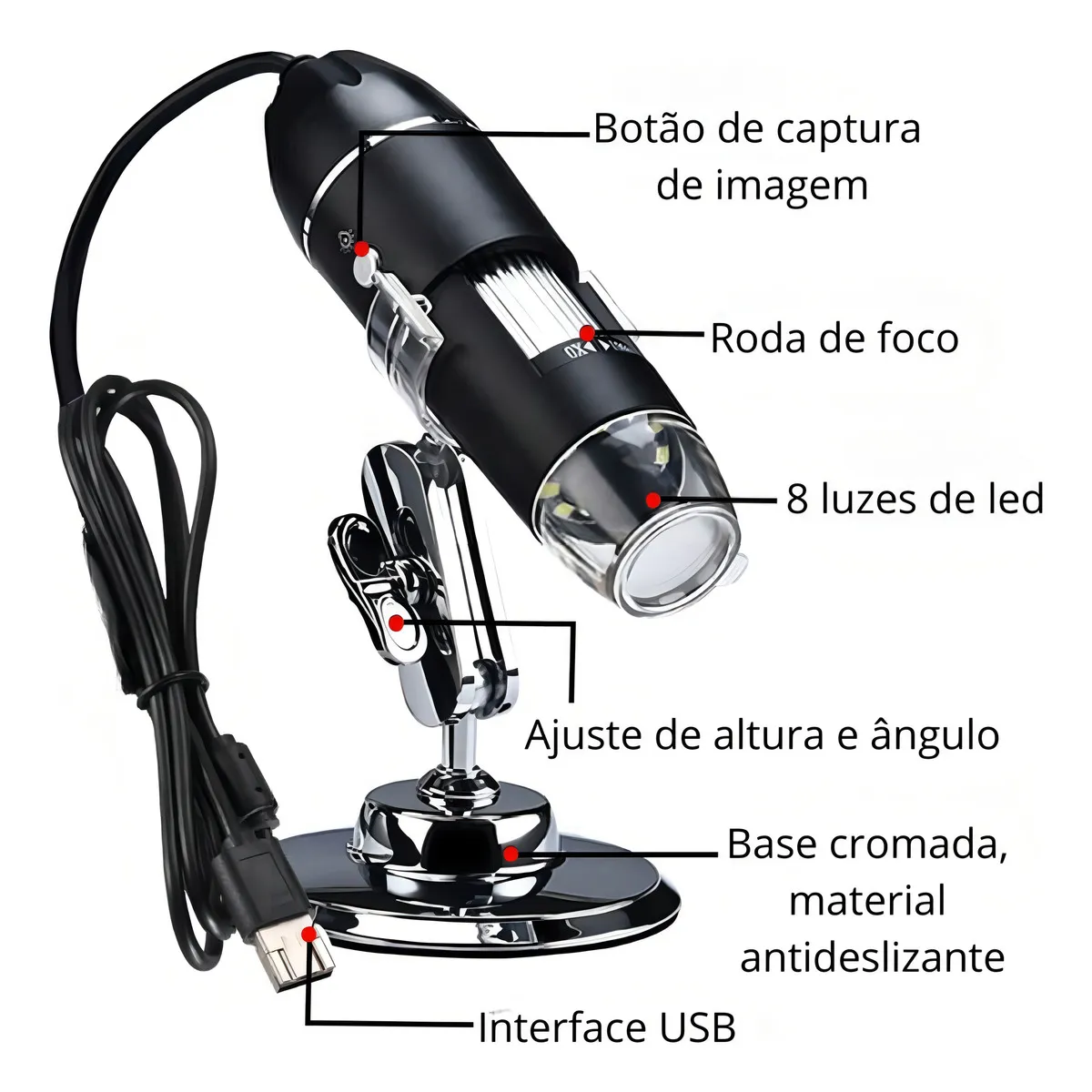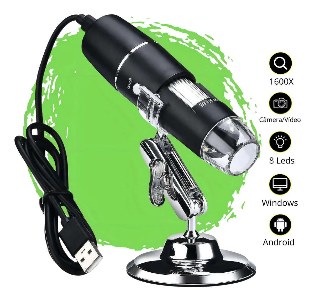 DIFERENCIAIS DO PRODUTO: – Ampliação de até 1600x: Permite observar estruturas microscópicas com riqueza de detalhes, ideal para aplicações que exigem alta definição, como amostras biológicas, circuitos eletrônicos, tecidos, moedas, insetos, entre outros. – Design Portátil e Funcional: Compacto e leve, ideal para transporte e uso em diferentes ambientes: laboratórios, salas de aula, oficinas ou até mesmo em casa. Acompanha suporte metálico que facilita o posicionamento e proporciona mais estabilidade durante o uso. – Conexão via USB: Compatível com computadores e notebooks, permite visualização em tempo real e captura de imagens e vídeos diretamente na tela. – Fácil Instalação e Uso Intuitivo: Conecte e use, basta plugar o cabo USB em um dispositivo compatível para começar a explorar o mundo microscópico. Simples e intuitivo, até iniciantes conseguem utilizar com eficiência. Oferecendo ampliação precisa e uso descomplicado, este microscópio é a opção perfeita para quem busca desempenho, versatilidade e praticidade em um único equipamento.